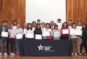 Los jóvenes recibieron la constancia por su participación y al final se tomaron la fotografía oficial que acredita su asistencia a los cursos que organiza el Centro Education USA Tlaxcala.