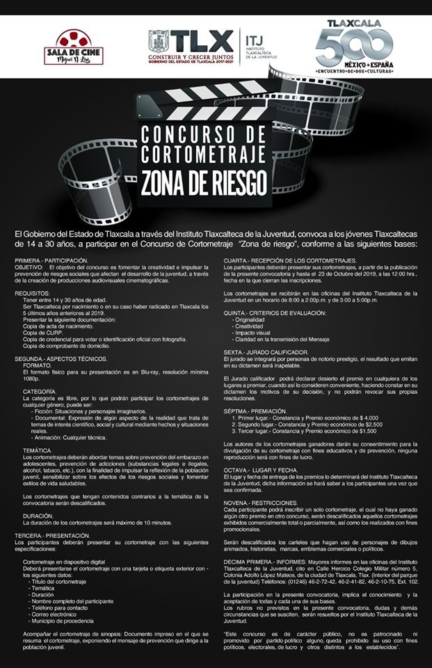 Tlaxcala, Tlax; a 05 de octubre 2019.- El Instituto Tlaxcalteca de la Juventud (ITJ) invita a los jóvenes tlaxcaltecas de entre 14 y 30 años de edad a participar en el concurso de cortometraje “Zona de riesgo” que tiene como objetivo fomentar la creatividad e impulsar la prevención de riesgos sociales que afectan el desarrollo de este sector de la población.