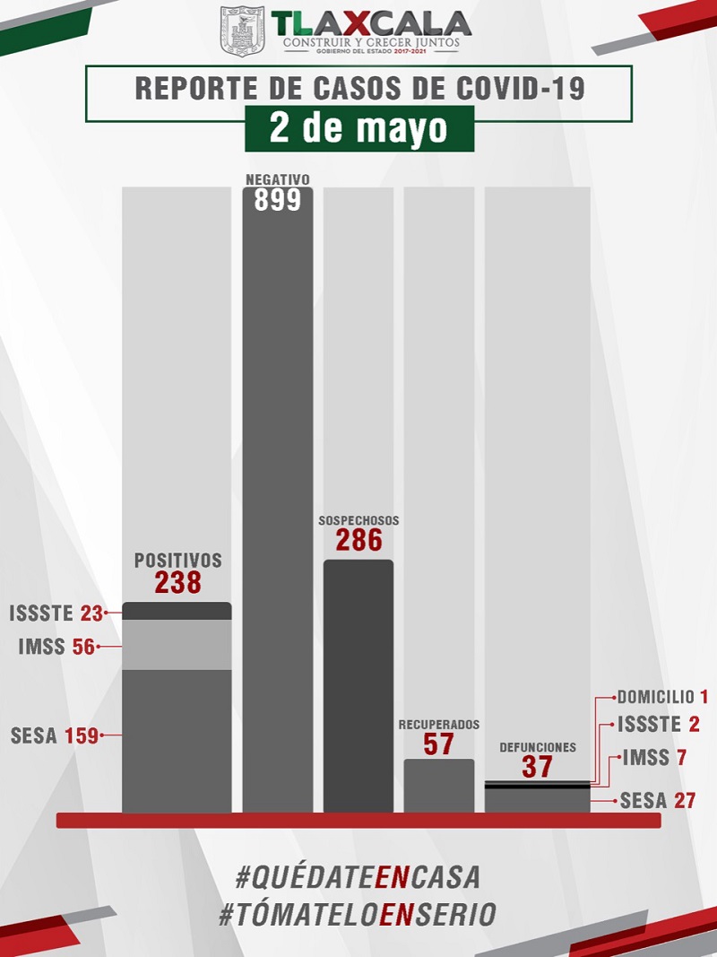 Tlaxcala, Tlax; a 02 de mayo 2020.- La Secretaría de Salud (SESA) confirmó tres casos más y un fallecimiento de Covid-19 en Tlaxcala.