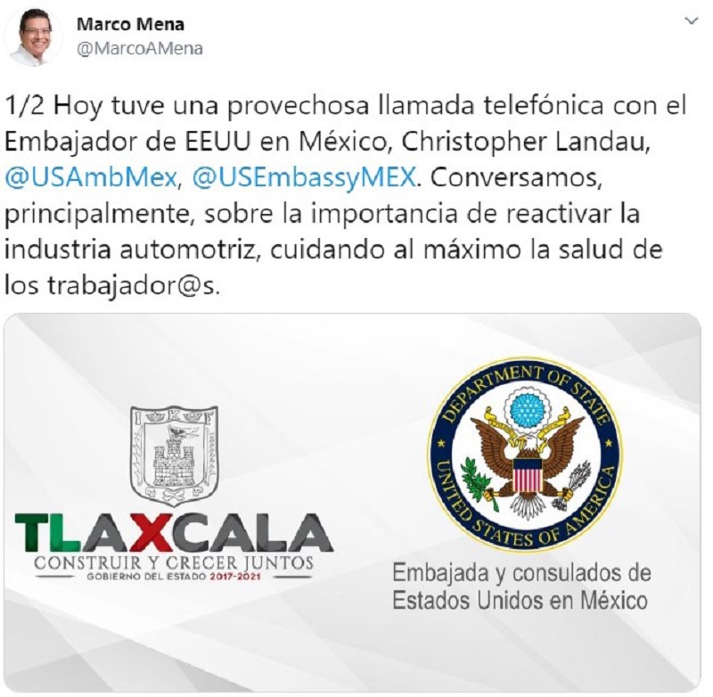 Marco Mena escribió: “1/2 Hoy tuve una provechosa llamada telefónica con el Embajador de EEUU en México, Christopher Landau, @USAmbMex, @USEmbassyMEX. Conversamos, principalmente, sobre la importancia de reactivar la industria automotriz, cuidando al máximo la salud de los trabajador@s”.