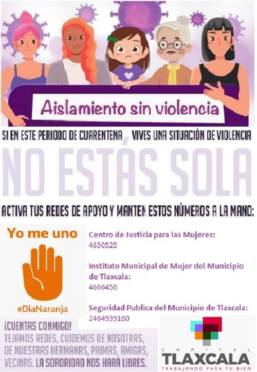 Pérez Rodríguez, dijo que quienes vivan en este periodo de cuarentena una situación de violencia no están solas, por lo que pueden solicitar ayuda en el IMM al número 46-6-64-56, a la Dirección de Seguridad Pública Municipal en el 246-493-91-60 e incluso al Centro de Justicia para las Mujeres al 46-5-05-25.