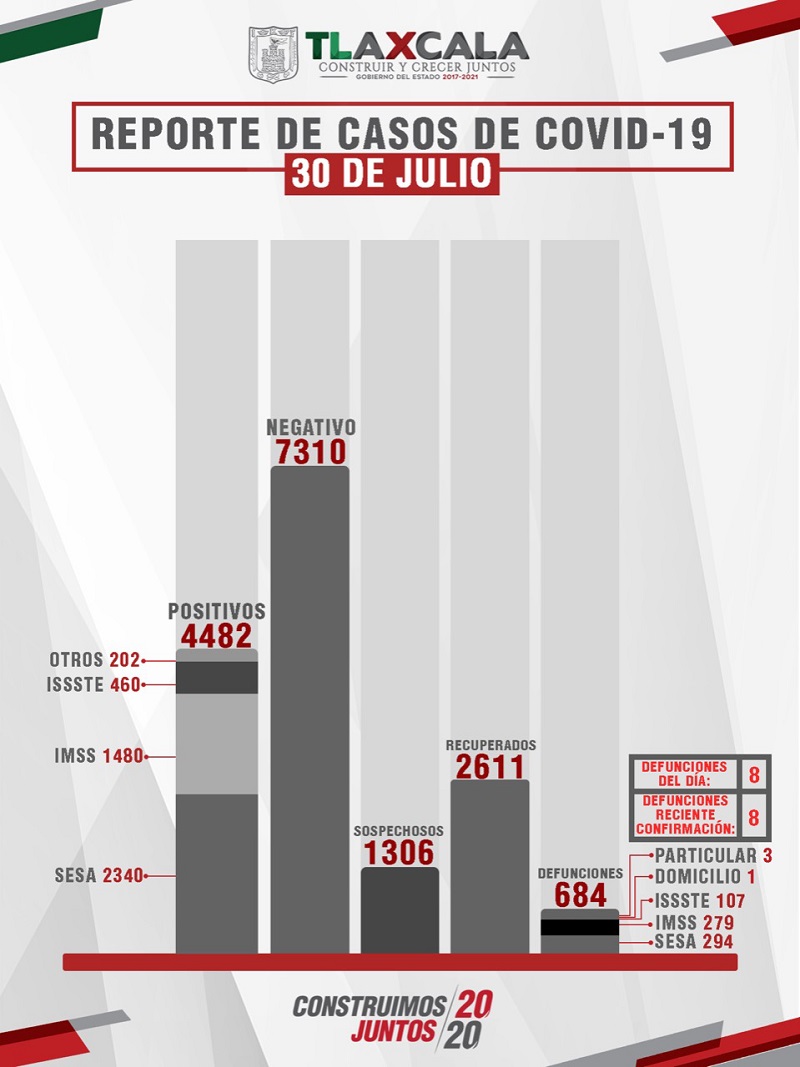 Tlaxcala, Tlax; a 31 de julio 2020.- De acuerdo con el reporte de este viernes, la Secretaría de Salud del Estado (SESA) confirmó 41 personas recuperadas, 70 casos positivos más y 8 fallecimientos de Covid-19 en Tlaxcala.