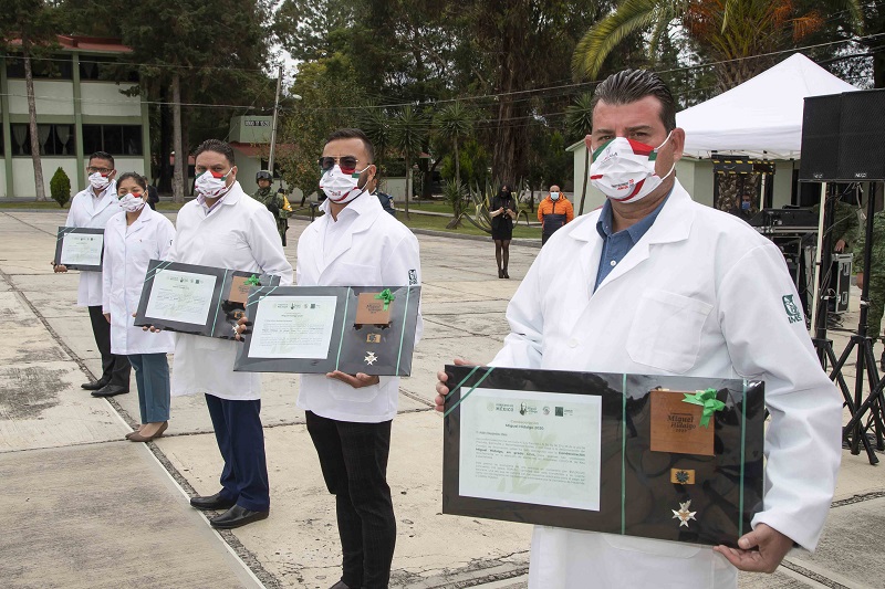Como parte de la ceremonia, los médicos María del Carmen Portillo Portillo y Rogelio Minor Cisneros, adscritos a la SESA; así como los galenos Adán Reygadas Melo, Omar Nahúm Beristaín Zempoalteca y Martin Espino Pluma del IMSS recibieron la condecoración “Miguel Hidalgo” en grado Cruz, que es la más alta presea que se otorga en el país a médicos distinguidos por conducta, trayectoria vital ejemplar, relevantes servicios a la patria, humanidad o actos heroicos.