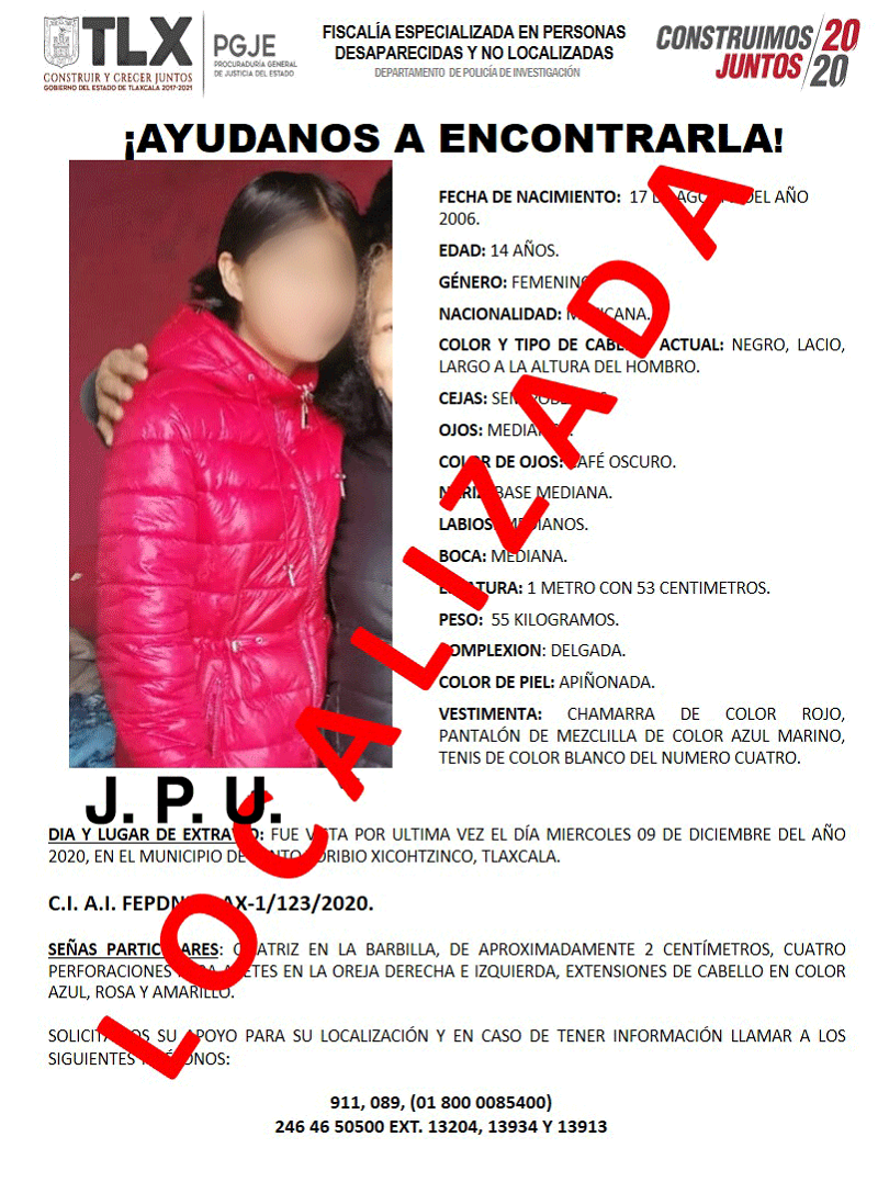 Tlaxcala, Tlax; a 15 de diciembre 2020.- La Procuraduría General de Justicia del Estado (PGJE) a través de la Fiscalía Especializad en Personas Desaparecidas y No Localizadas, ubicó a una menor de edad reportada como extraviada, quien en ningún momento fue víctima de algún delito.