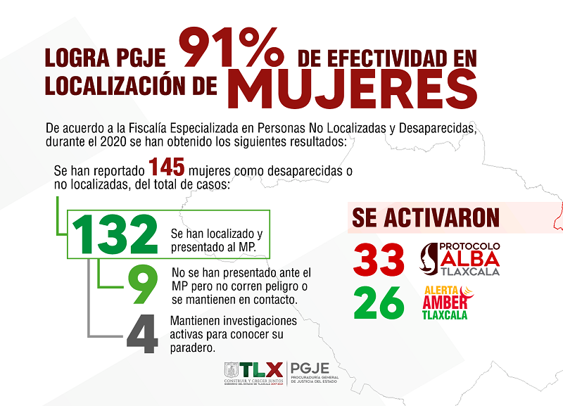 LOGRA PGJE 91 POR CIENTO DE EFECTIVIDAD EN LOCALIZACIÓN DE MUJERES EN 2020