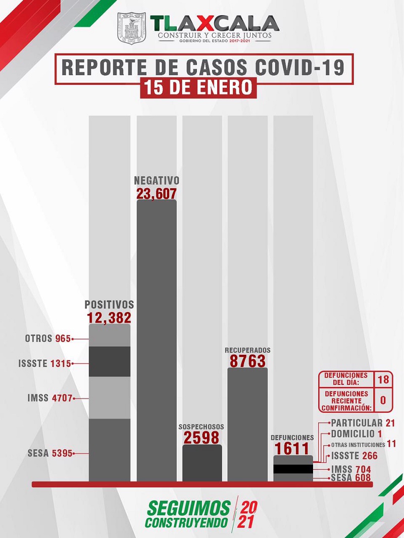 Tlaxcala, Tlax; a 16 de enero 2021.- De acuerdo con el reporte del 15 de enero, la Secretaría de Salud del Estado (SESA) confirmó 86 personas recuperadas, 18 fallecimientos y 114 casos positivos de Covid-19 de tlaxcaltecas identificados en el estado y ocho en otras entidades.