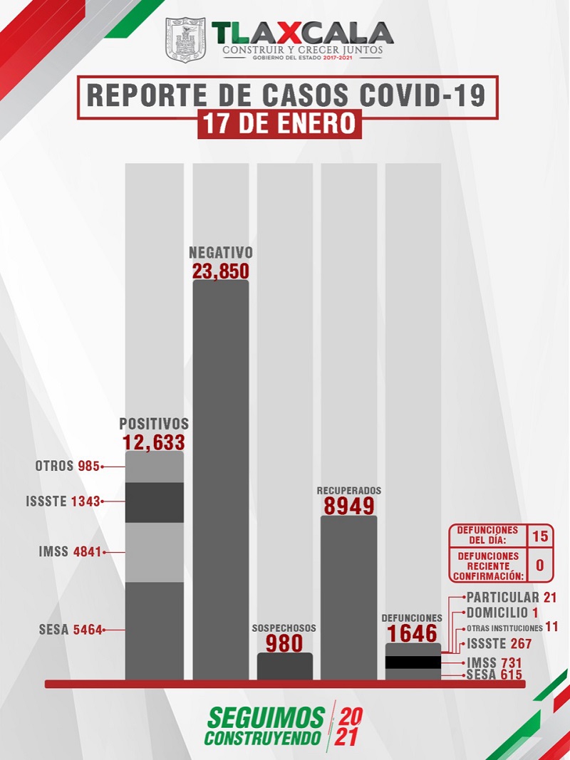 Tlaxcala, Tlax; a 18 de enero 2021.-De acuerdo con el reporte del 17 de enero, la Secretaría de Salud del Estado (SESA) confirmó 106 personas recuperadas, 15 fallecimientos y 106 casos positivos de Covid-19 de tlaxcaltecas identificados en el estado y 19 en otras entidades.
