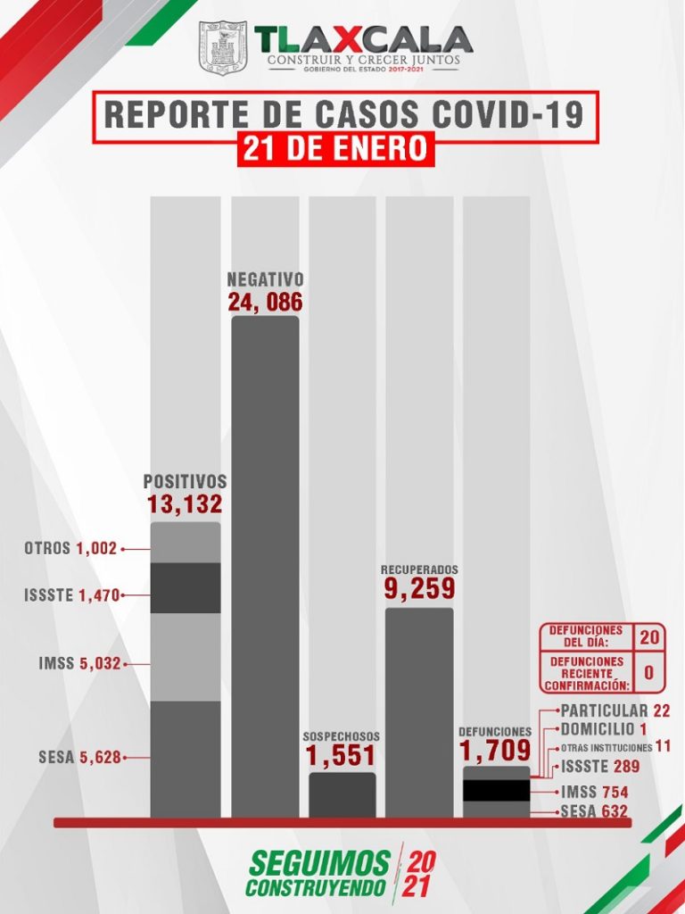 Como parte de la información que presentó la SESA, se informó que, de acuerdo con el reporte del 21 de enero, se confirmaron 59 personas recuperadas, 113 casos positivos de Covid-19 de tlaxcaltecas identificados en el estado y 8 en otras entidades, además de 20 fallecimientos, de los cuales siete se registraron en la SESA, nueve en el IMSS y cuatro en el Issste.