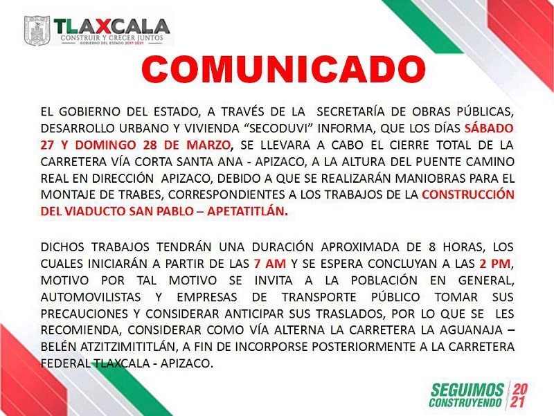 Tlaxcala, Tlax; a 26 de marzo 2021.-La Secretaría de Obras Públicas, Desarrollo Urbano y Vivienda (Secoduvi) dio a conocer que el sábado 27 y domingo 28 de marzo, se llevará a cabo el cierre total de la carretera vía corta Santa Ana-Apizaco, a la altura del puente Camino Real en dirección a Apizaco, debido a que se realizará el montaje de trabes como parte de la construcción del Viaducto San Pablo-Apetatitlán.