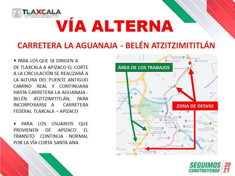 De esta manera, para quienes se dirijan de Tlaxcala a Apizaco, el corte a la circulación se realizará a la altura del puente Antiguo Camino Real, deberán continuar hasta la carretera La Aguanaja-Belén Atzitzimititlán, para posteriormente incorporarse a la carretera federal Tlaxcala-Apizaco.