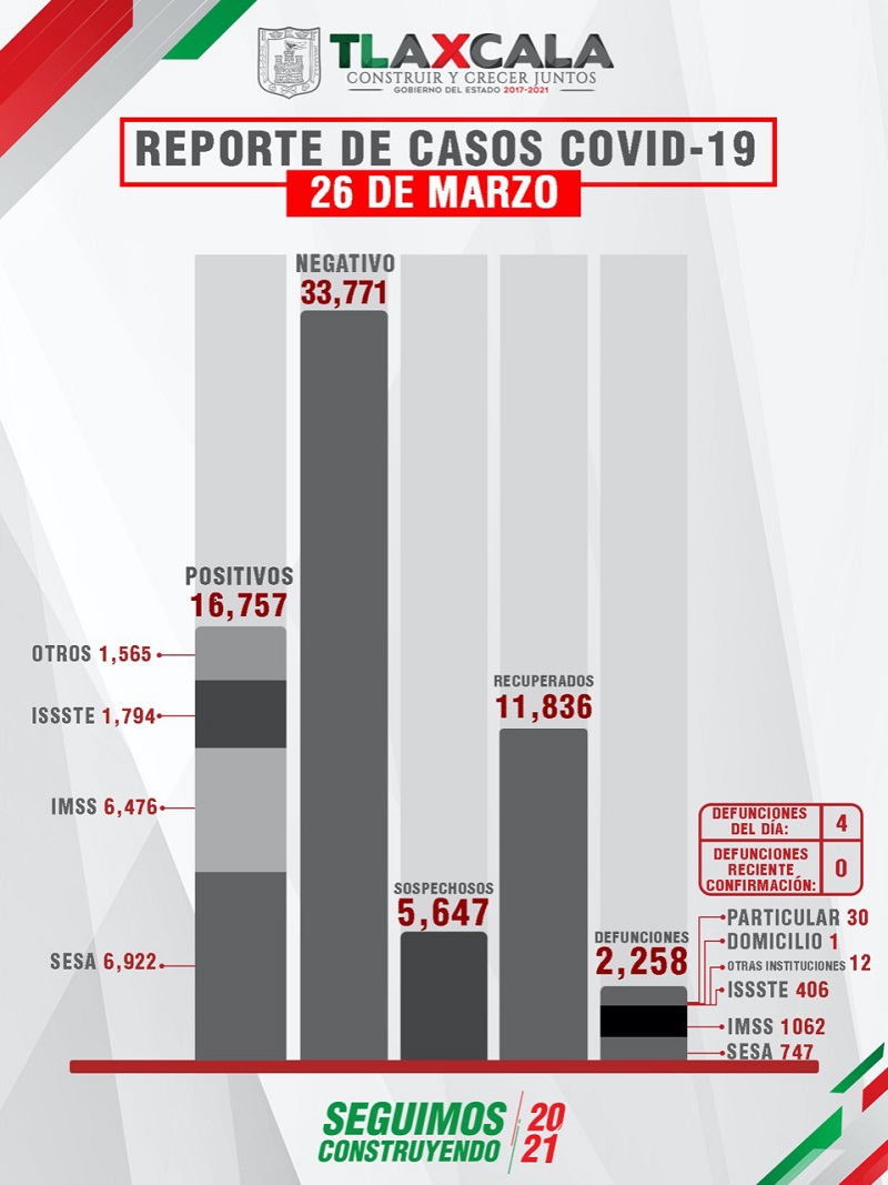 Tlaxcala, Tlax; a 27 de marzo 2021.- De acuerdo con el reporte del 26 de marzo, la Secretaría de Salud del Estado confirmó 21 personas recuperadas, 4 fallecimientos y 20 casos positivos de Covid-19 de tlaxcaltecas identificados en el estado y 14 en otras entidades.