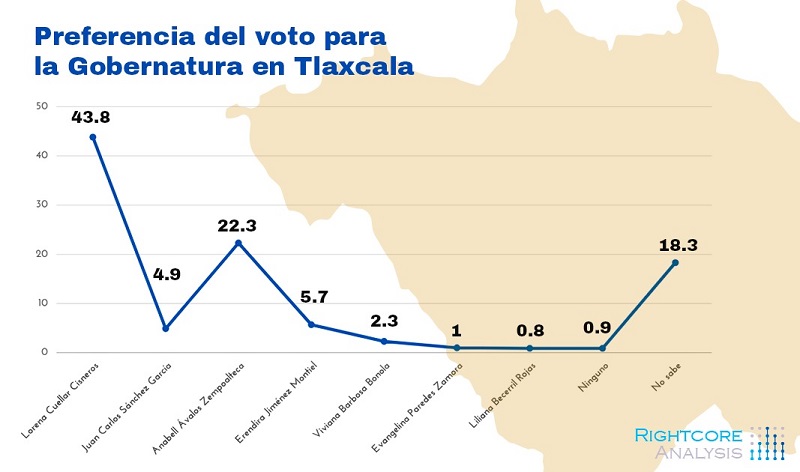 Lorena Cuéllar va a la cabeza con un 47 por ciento seguida de Anabell Ávalos con el 21.5 por ciento; luego se encuentra Juan Sánchez con el 5.2 por ciento y Eréndira Jiménez tiene el 4.3 por ciento, según Online Data.