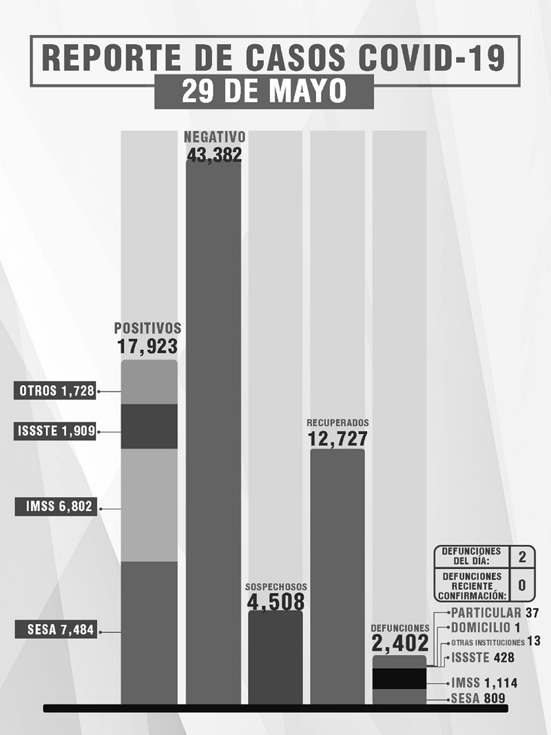 De esta manera, el estado registra 12 mil 727 personas recuperadas, 17 mil 923 casos positivos y dos mil 402 fallecimientos.