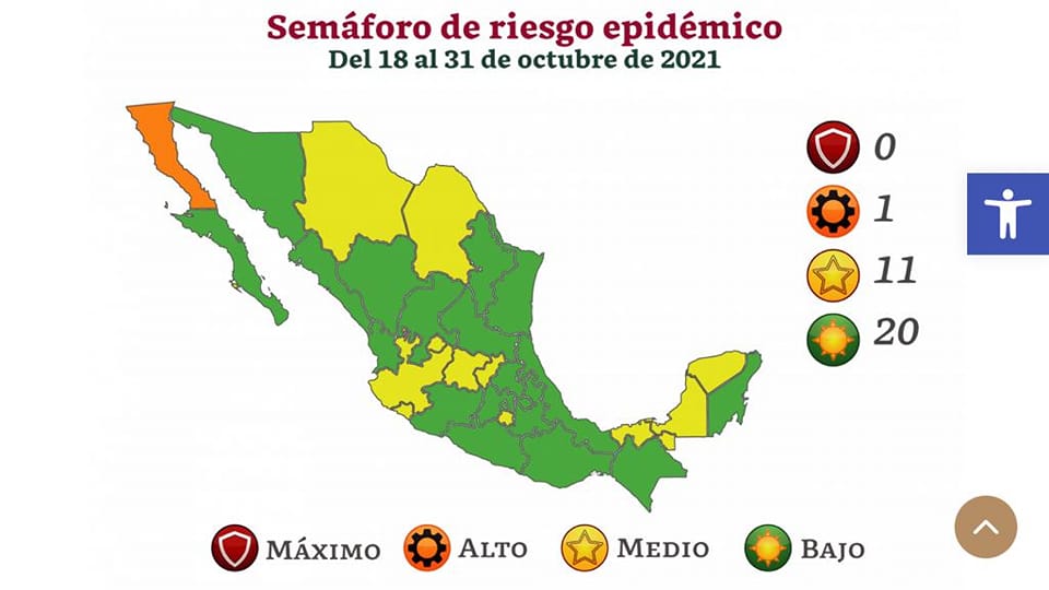 Este viernes 15 de octubre, la dependencia federal informó la actualización correspondiente del semáforo epidemiológico de Covid-19 en el país, en el cual ningún estado se encuentra en color rojo, que representa el riesgo máximo de posibles contagios, uno permanecerá en naranja durante los próximos 15 días, 11 entidades más en amarillo y 20 estados del país, incluido Tlaxcala, estarán en color verde.