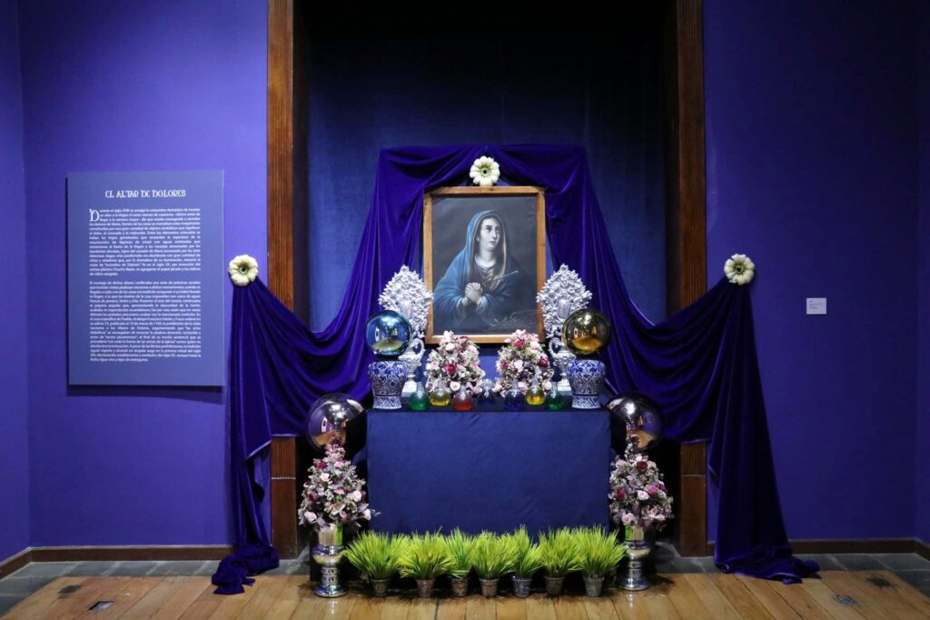 Esta muestra está dividida en cuatro temáticas: los orígenes teológicos e iconográficos de dicha representación, el arraigo y devoción en la época virreinal, en el tercero son expuestas las pinturas realizadas por algunos de los más importantes pintores poblanos y por último un montaje del altar de Dolores.