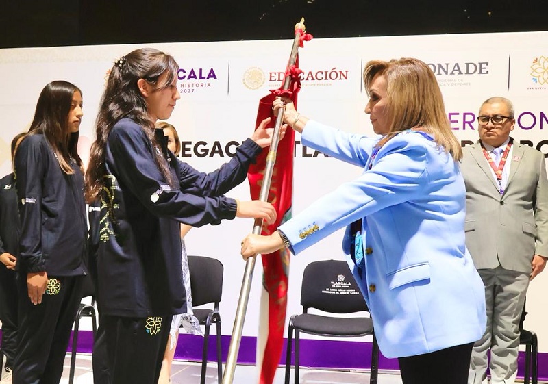 Tlaxcala, Tlax; a 17 de mayo 2023.- La gobernadora Lorena Cuéllar Cisneros abanderó a la delegación tlaxcalteca que participará en los Juegos Nacionales de la Comisión Nacional de Cultura Física y Deporte (Conade) 2023, a realizarse del 24 de mayo al 24 julio.