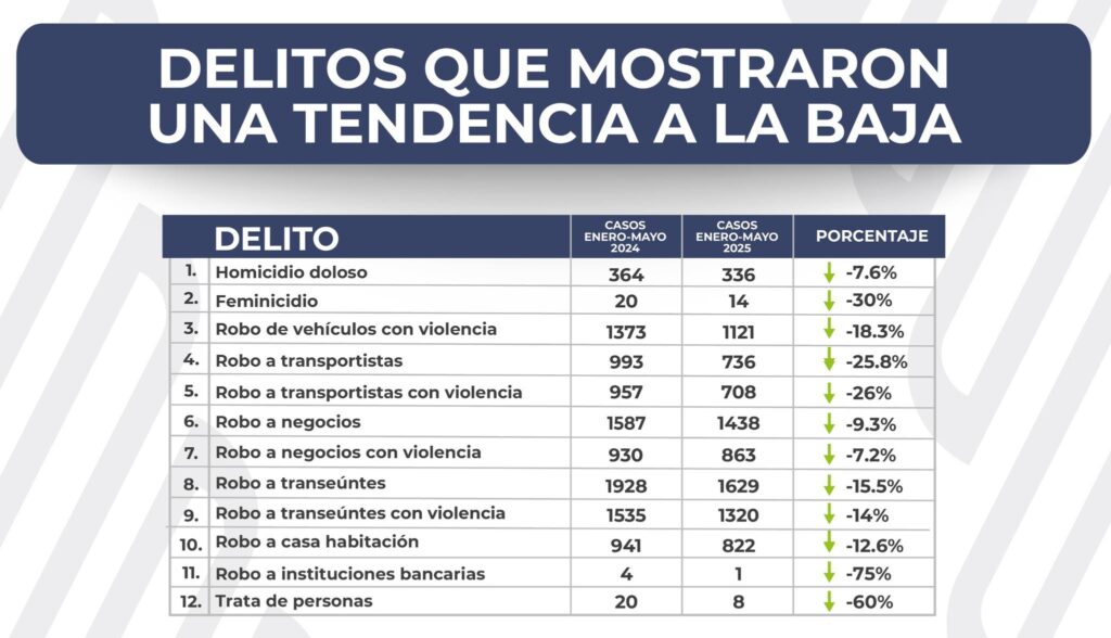 Se reducen 12 delitos de impacto social en el estado de #Puebla durante los primeros 5 meses de este año, en comparación con el mismo periodo de 2024; se trata de los homicidios dolosos, el feminicidio, que mantiene una tendencia a la baja, así como los robos de vehículos con violencia, a transportistas, a negocios, a transeúntes, a casa habitación, a instituciones bancarias y la trata de personas.