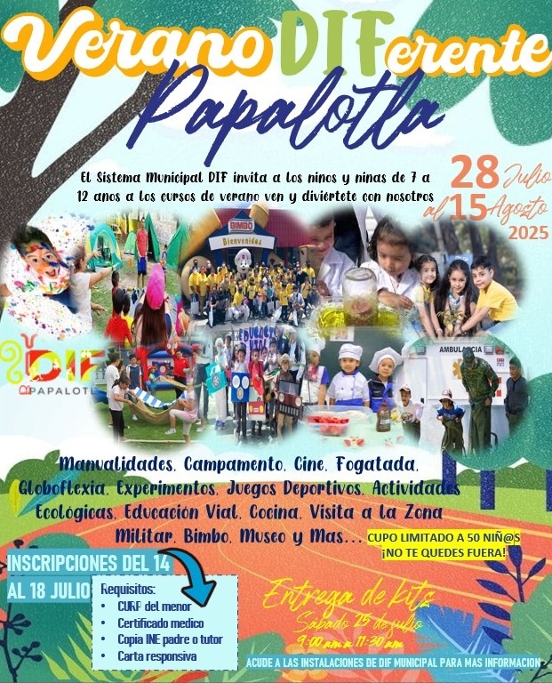 El Sistema Municipal DIF de Papalotla anunció la apertura de inscripciones para su curso “Verano DIFerente Papalotla”, dirigidos a niños y niñas de 7 a 12 años de edad.