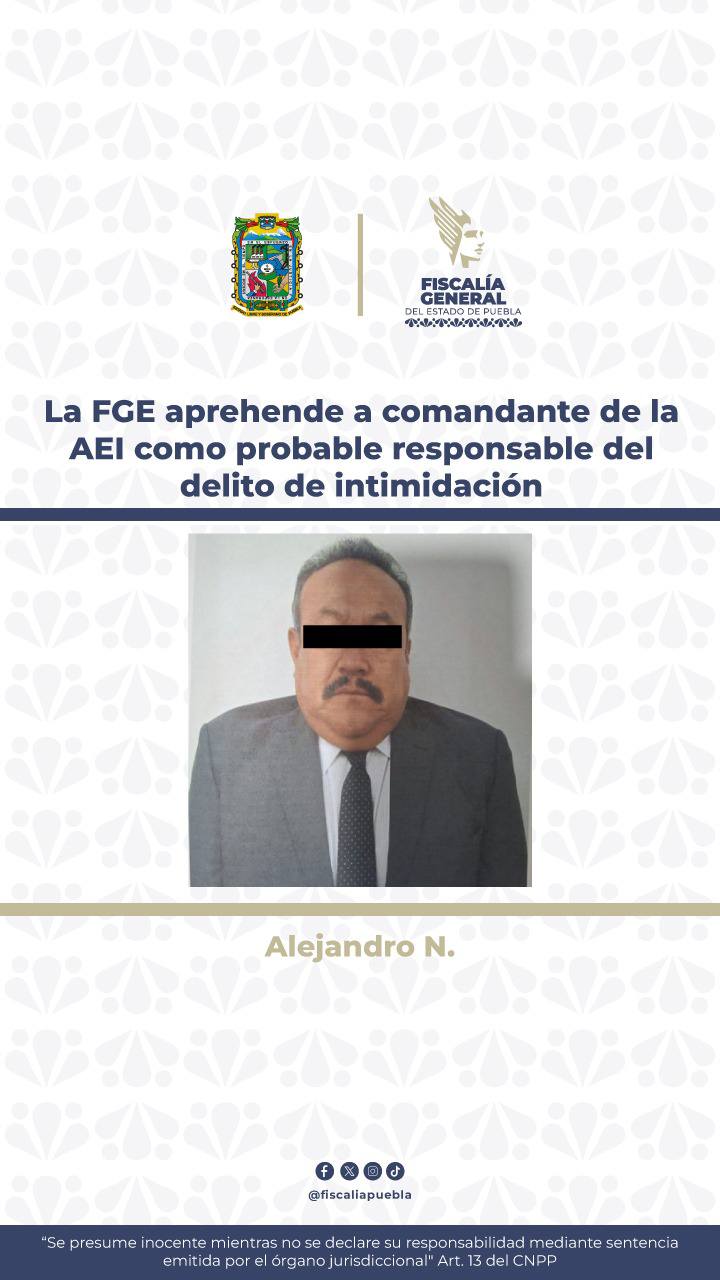 Puebla, Pue; a 28 de julio 2025.- La Fiscalía General del Estado, en cumplimiento a las acciones de depuración de su personal que tenga posibles nexos con grupos delincuenciales, informa la detención de Alejandro N., quien se desempeñaba como comandante de la Unidad de Investigación adscrita a la Fiscalía Especializada en Investigación de los Delitos de Desaparición Forzada de Personas y Desaparición Cometida por Particulares, dando así cumplimiento a la orden de aprehensión emitida por la autoridad judicial, como probable responsable del delito de intimidación, además de encontrarse bajo investigación por su posible participación en otros hechos con apariencia de delito.