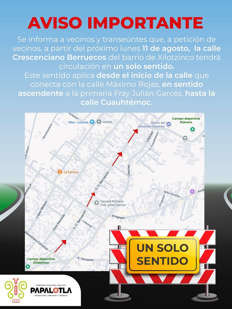 Es así que en coordinación y consenso con los vecinos del barrio que expresaron la problemática de congestión vial, sobre todo en horarios de salida y entrada a la escuela que se localiza en la zona, se acordó en asamblea con el comité del barrio, que la calle Crescenciano Berruecos funcionará bajo un sistema de circulación de un solo sentido desde el inicio de ésta, en la zona que conecta con la calle Máximo Rojas, en sentido ascendente a la primaria Fray Julián Garcés, hasta la calle Cuauhtémoc.