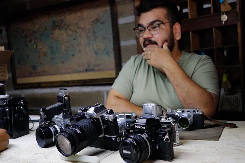 Martin Márquez, artista tlaxcalteca, ha encontrado en la fotografía análoga un medio para expresarse, además de su obra fotográfica ha reunido una colección de cámaras antiguas, mismas que ha usado hasta la fecha para sus proyectos. El día de hoy se conmemora el Día Mundial de la Fotografía, actividad en la que México destaca a nivel mundial con sus artistas, en todos sus generos. Imagen: Cristihan Martínez / Nierika Images