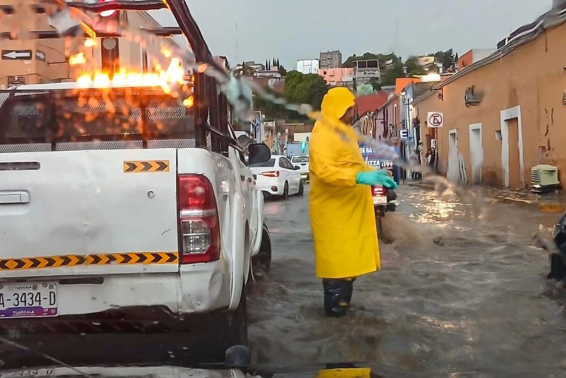 Tlaxcala, Tlax; a 13 de septiembre 2025.- Ante la intensa lluvia registrada esta tarde en la capital, el Ayuntamiento de Tlaxcala desplegó a miembros de la Brigada de Atención y Contención en los puntos que más lo necesitaron, quienes acordonaron las calles con mayor acumulación de agua y realizaron labores de limpieza en rejillas y coladeras, con el objetivo de garantizar el desahogo adecuado, a fin de proteger a las familias.