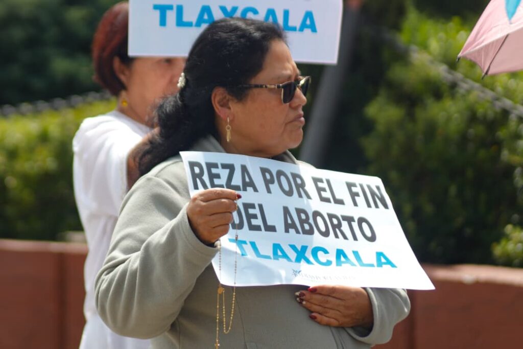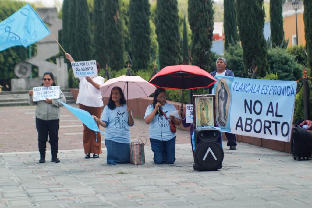 Integrantes de la organización religiosa “40 días por la vida” realizaron esta mañana una jornada de rezos frente al palacio legislativo, en Tlaxcala capital, para manifestarse en contra de la la despenalización del aborto, acción que vienen realizando desde el pasado 24 de septiembre, para finalizar el 2 de noviembre del presente año. Imagen: Cristihan Martínez / Nierika Images