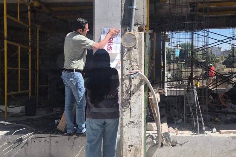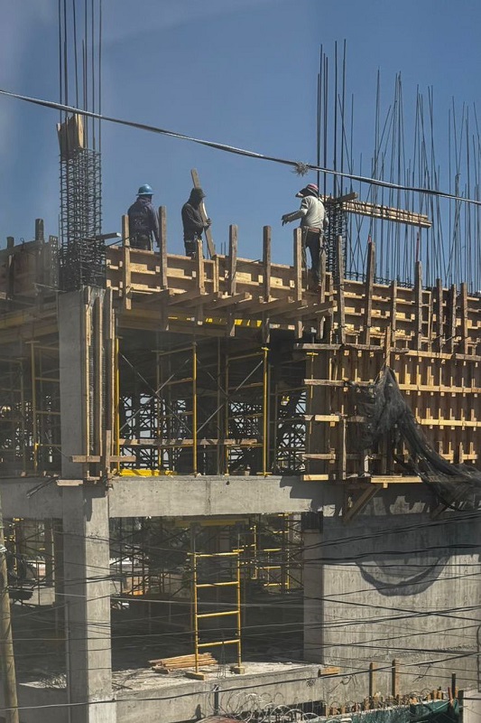 A pesar de haber sido suspendida la obra de construcción, por presuntamente carecer de permiso de Uso de Suelo, en lo que sería un colegio de seis pisos, trabajadores de la construcción cubrieron sellos de suspensión y continuaron trabajando esta mañana con normalidad, en esta obra que se ubica en la estrecha calle Quiahuixtlan de la colonia San Isidro, en Tlaxcala capital, zona que cuenta, en general, con calles angostas y no aptas para el tráfico que está obra generaría, señalan vecinos. Imagen: Andrés Martinez / Nierika Images
