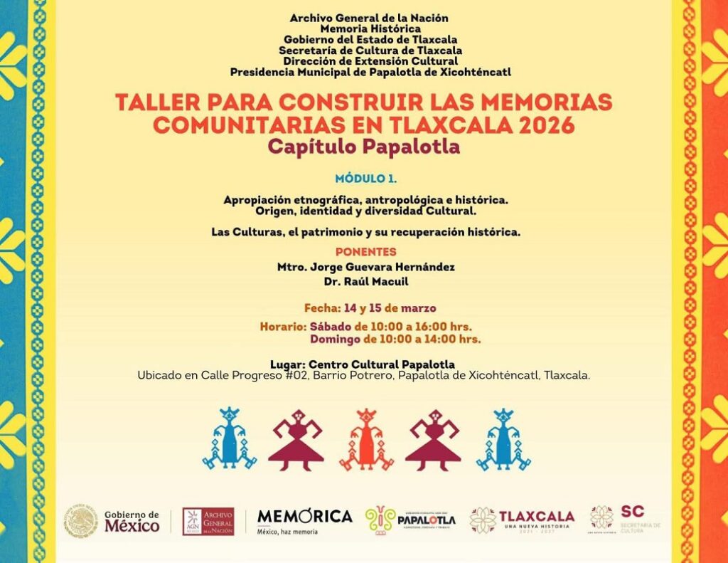 Papalotla, Tlax; a 10 de marzo 2026.- El Centro Cultural de Papalotla de Xicohténcatl acogerá a partir del próximo 14 de marzo el Taller para Construir las Memorias Comunitarias en Tlaxcala 2026, Capítulo Papalotla, una iniciativa impulsada de manera conjunta por el Archivo General de la Nación, la Secretaría de Cultura de Tlaxcala, la Dirección de Extensión Cultural y la Presidencia Municipal de Papalotla de Xicohténcatl.
